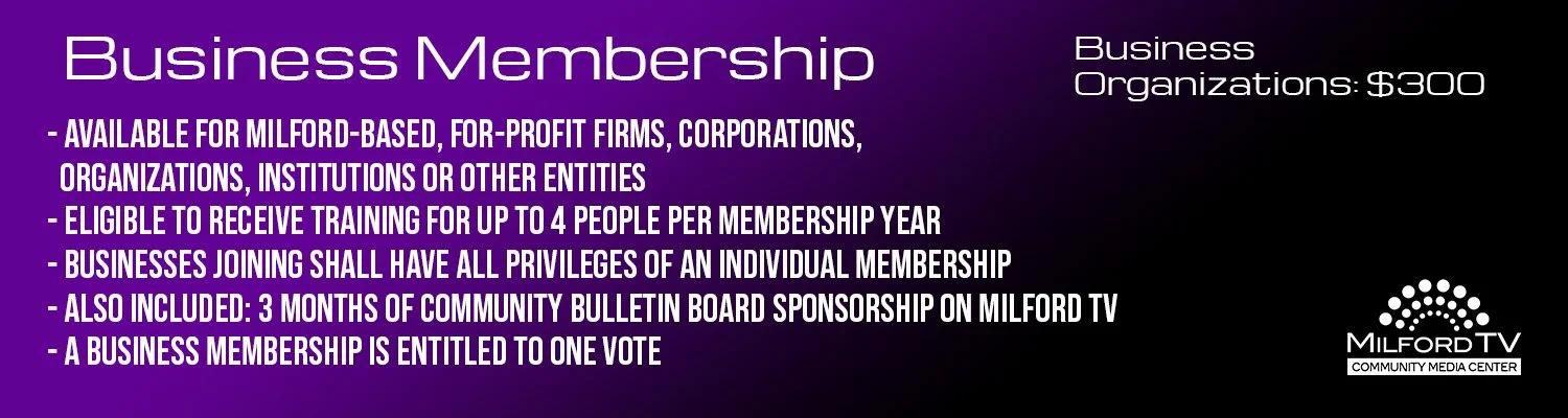Milford Community Media Center provides access to local information, education and entertainment. We provide the community, through annual memberships and volunteer opportunities, access to technology, education and resources to create or assist in creating a wide variety of programs ranging from single camera interviews to multi-camera studio and field shows.